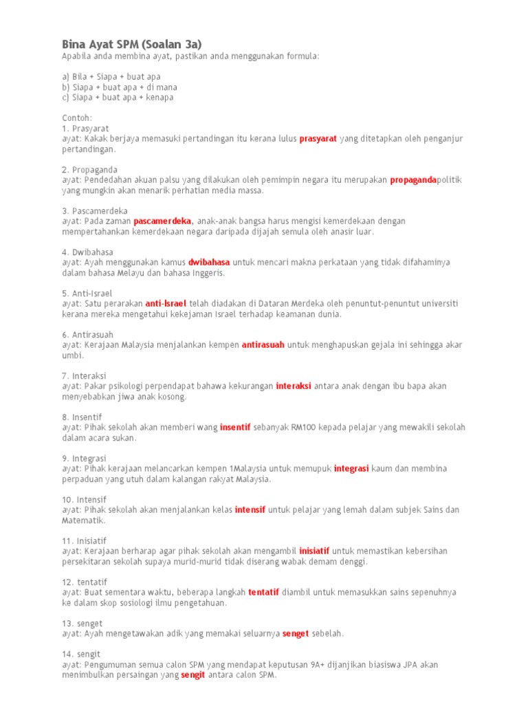 Laman Bahasa Melayu Spm Cadangan Soalan 3 A Membina Ayat Menggunakan Perkataan Diberi Peperiksaan Percubaan Spm Mrsm